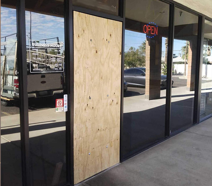 If you discover broken glass in your storefront door or window, we provide emergency services to secure your business. Our priority after-hours response and emergency board-up services will ensure you can get your business back up and running in no time.